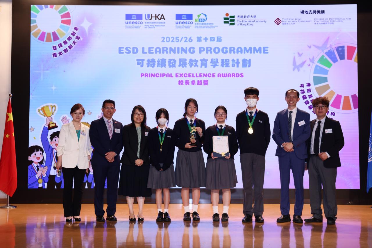 We are delighted to share that our students, Cheng Yuet-tung (5A), Cheng Lok-yin (5A), Lo Yu-tung (5C) and Chuang Tsz-yi (4C), have received the Principal Excellence Award in the 14th ESD Learning Programme 2025/26, jointly organised by the Hong Kong UNESCO Association, the Hong Kong Institute of Education for Sustainable Development, and the Education University of Hong Kong.